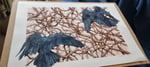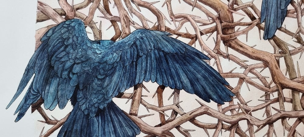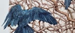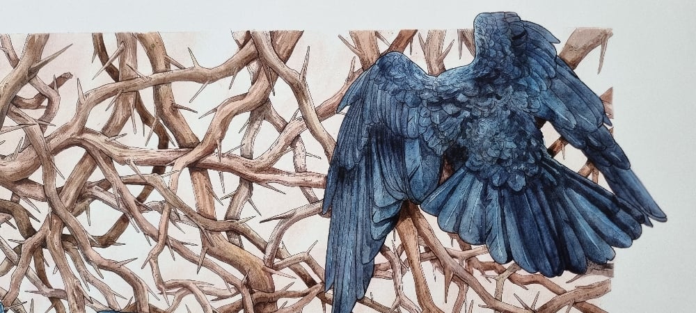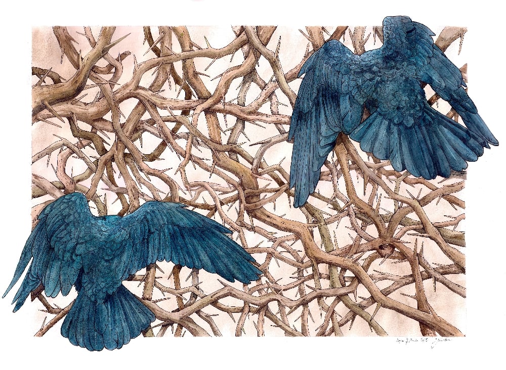 "The god king Odin's two ravens, from the old faith, are a well-known motif dating back to the Iron Age. In this work, Vibeke Glarbo's woodcut Sortkrager, 2022, is reinterpreted as these well-known god figures. In the interpretation, the ravens are turned away from the viewer and towards a chaos of thorny branches that lead the thoughts to an inner universe."